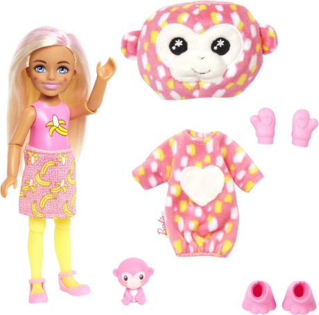 Packaging content Includes Barbie Cutie Reveal Chelsea doll wearing costume (4-piece set) and 3 bags containing mini pet, 1 pair of shoes and a skirt. Doll cannot stand alone. Colours and decorations may vary.