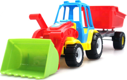 Traktors ar piekabi ir ideāli piemērots spēlēšanai mājās un dārzā. Priekšpusē ir kauss, kurā var iekraut smiltis. Traktoram ir piekabe, ar kuru var pārvadāt birstošas vielas. Piekabe ir viegli piestiprināma pie traktora. Traktora garums ar piekabi: 62 cm. Vecums: 3+ Iepakojuma izmēri: 66x15x18 cm.