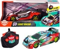 | RC Light Razor Colorful driving fun with LEDs and sound effects - the RC Light Razor from Dickie Toys! This toy car is the perfect gift for all car fans. With its multi-colored LEDs, it is not only chic to look at, light and sound effects ensure even more fun! The RC Light Razor is a fast and agile sports car with grippy tires so the car doesn't lose grip on the track and corners. If the car does go off track, the robust body ensures that nothing happens to the car. The toy car is equipped with radio control (2-channel FS, 2.4 GHz). It lies well in the hand and transforms every child's room into a race track. The charming RC Light Razor reaches a maximum speed of up to 7 km/h. Ideal for an exciting race! Type: car Color: Multicolour EAN code: 4006333079993 Manufacturer part number: 201105002 Age recommendation: from 6 years Material: Plastic Operation: Electronic audio: yes Lighting: yes Use: driving Scale: 1:16 Directions of movement: forward/backward, left/right Speed: 7 km/h Use: indoors, outdoors Model details: Grippy tires, robust body Connection Type: 2.4GHz Number of transmission channels: 2 Warnings: Caution: Not suitable for children under 36 months! Warnings: Attention: Danger of suffocation due to small parts! Feature: light and sound effects Accessories: available | Remote control Accessories: required | batteries |