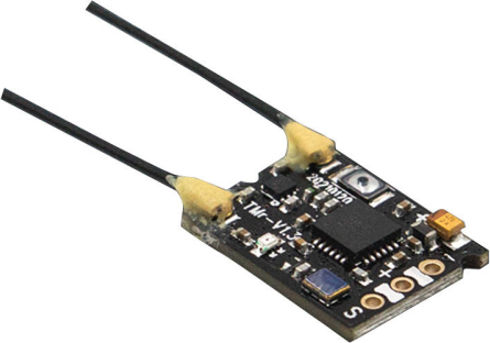 The TMR model is a compact dual-antenna receiver that operates at 2.4 GHz. Its dimensions are only 16 x 12 x 2 mm, and it weighs only 0.9 g. It uses the modern AFHDS3 protocol and is compatible with EL18 and FS-PL18 transmitters. It supports RSSI power indicator and PWM, PPM, i.BUS and S.BUS output signals.