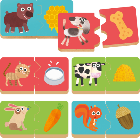| Par ko kaķis ir sajūsmā? Un ko ēd kucēns? Izklaidējies, savienojot mazos dzīvnieciņus ar viņu iecienītāko ēdienu! Izgatavota no izturīga koka un ar īpašiem izglītojošiem savienojumiem, šī spēle attīsta mazu bērnu loģisko domāšanu un sīko motoriku. | ||||||||||||||||||||