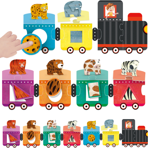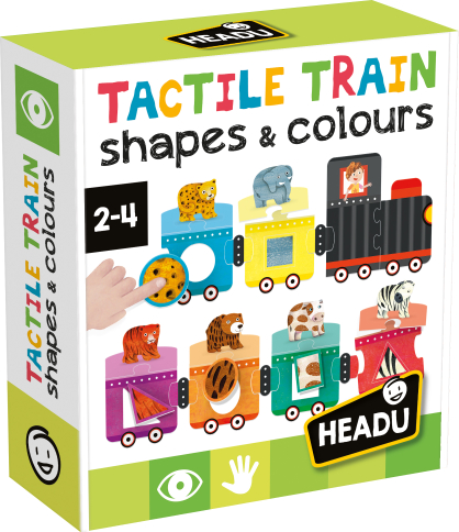 Priecīgs taustes vilciens ar izglītojošu sistēmu, kas palīdz maziem bērniem atpazīt pamata formas un krāsas, kā arī kopā ar draudzīgiem dzīvnieciņiem – dažādus krāsu toņus.