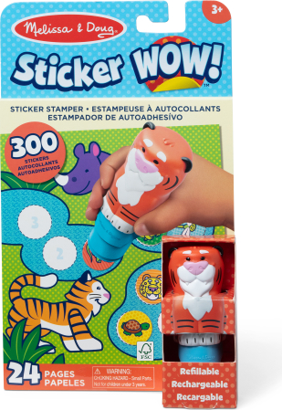 | Melissa & Doug Sticker WOW! uzlīmju spiedējs ir pavisam jauns veids, kā rotaļāties ar uzlīmēm! Ļaujiet burvīgajam, kolekcionējamajam tīģerim Ķirbītim apzīmogot visas 24 lappuses, kas veltītas jautrām safari tēmām, skaitīšanas, saskaņošanas, meklēšanas un atrašanas darbībām. Atkārtoti uzpildāmajā uzlīmju spiedējā jau ir ielādētas 300 dažādas uzlīmes — ar 100 unikāliem dizainiem katrā iepakojumā, turklāt katra uzlīme ir kā pārsteigums! Tematiskie uzpildes iepakojumi tiek pārdoti atsevišķi un tie sader ar jebkuru Sticker WOW! uzlīmju spiedēju. Uzlīmes nav atkārtoti lietojamas, taču vajadzības gadījumā tās var viegli noņemt. Aizpildiet aktivitāšu lapas un izmantojiet radošiem mākslas projektiem, piemēram, veidojot grāmatzīmes, plakātus, kartītes un daudz ko citu. Viegli noņemamās uzlīmes un ērtais formāts līdzņemšanai ar iebūvētu vietu uzglabāšanai uzlīmju spiedējā padara Sticker WOW! (patents pieteikts) par lielisku ceļojumu nodarbi, kas nerada nekārtību. Sticker WOW! uzlīmju spiedējs veicina smalko motoriku, rosina radošas rotaļas, sniedz gandarījumu un ļauj jautri pavadīt laiku! | ||||||||||||||||||||
