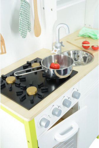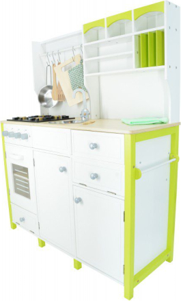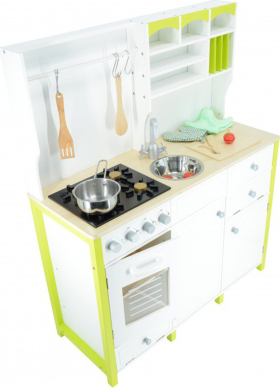 | Moderna virtuvīte mazajiem pavāriem! Durvis veras vaļā, rokturi griežas, vairāki plaukti, āķi virs plīts virsmas ļaus glīti piekarināt karotes un lāpstiņas. Dažādi aksesuāri (lāpstiņas, koka nazis, bļoda, katls, cimdiņš, griešanas dēlītis) palīdzēs mazajam šefpavāram pagatavot gardus ēdienus. Virtuvīte noteikti sagādās prieku un vienlaikus rosinās radošumu un attīstīs iztēli.