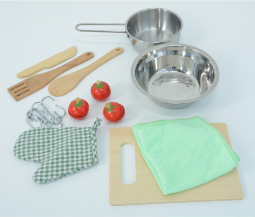 • 11 piederumi (2 lāpstiņas, koka nazis, bļoda, katls, cimds, griešanas dēlītis, dvielis un trīs koka tomāti)