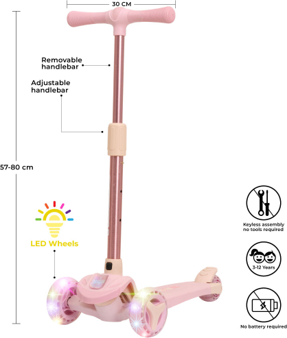 Jautājumi un atbildes J: Vai Story Mini Friends LED Deluxe ir salokāms? A: Nē, Story Mini Friends LED Deluxe nav locīšanas mehānisma. Neskatoties uz to, kātu var bez piepūles atdalīt no pamatnes, atvieglojot ērtu uzglabāšanu vai transportēšanu. J: Vai stūre ir regulējama? A: Pilnīgi noteikti, Story Mini Friends LED Deluxe stūre ir pielāgojama. Kad tas ir iestatīts zemākajā pozīcijā, stūre sasniedz 48 cm augstumu. Tā maksimālais augstums sasniedz 69 cm. Jūs varat brīvi iestatīt stūri jebkurā augstumā starp šiem diviem mērījumiem, nodrošinot pareizu piemērotību jūsu bērnam. Uzziņai iesakām novietot stūres augšdaļu tieši ap bērna nabu. J: Kas darbina apgaismotos riteņus? A: Story Mini Friends LED Deluxe demonstrē apgaismes riteņus bez akumulatora. Šie riteņi darbojas ar indukcijas tehnoloģiju, izmantojot enerģiju, kas rodas, jūsu bērnam skrienot. Šis ģeniālais dizains pārvērš to kustību spīdošos riteņos, nodrošinot bezrūpīgus un ilgstošus piedzīvojumus. J: Kāds vecuma diapazons ir piemērots Story Mini Friends LED Deluxe skrejritenim? A: Story Mini Friends LED Deluxe ir paredzēts bērniem vecumā no 3 līdz 12 gadiem. J: Vai Story Mini Friends LED Deluxe ir bremžu sistēma? A: Jā, tiešām. Pārsteidzoši, ne visi motorolleri piedāvā šo funkciju. Story Mini Friends LED Deluxe ir aprīkots ar rūpīgi izstrādātu bremzi, kas pielāgota mazu bērnu pēdām. Šis dizains nodrošina, ka visa pēda var nosegt bremzes, nodrošinot viņiem absolūtu kontroli. J: Kāds ir Story Mini Friends LED Deluxe skrejriteņa svars? A: Story Mini Friends LED Deluxe skrejritenis ir iespaidīgi viegls, sverot 3,5 kg, un tā svars ir ar nolūku izveidots kādam mērķim. Tā vieglā konstrukcija ļauj mazākiem bērniem ērti rīkoties ar skrejriteni. Šī funkcija ļauj bērniem viegli pacelt un nest skrejriteni, piemēram, pāri apmalēm. Šī pieeja veicina pārliecību, ka mācās braukt, un nodrošina pilnīgu meistarību, kad tā ir sasniegta. Vecums: 3-12 gadi Kopējais augstums: 57-80 cm Bez akumulatora iedegas LED riteņi Noliecies, lai pagrieztos -> Nostiprini līdzsvaru un kontroli Noņemama stūre Neslīdoša gumijas stūre Neslīdošs klājs / stāvoša platforma Dubultā stūres drošības slēdzene bērniem Liela un droša bremze |