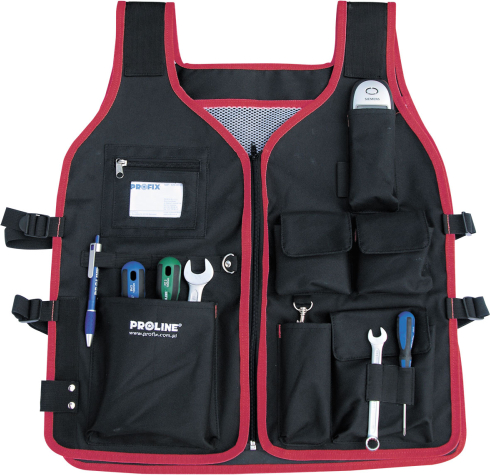 | Jebkuram izmēram pielāgojama poliestera veste ar 8 kabatām, 7 elastīgām siksnām priekš skrūvgriežiem, 1 āmura turētāju un 1 āķi. |