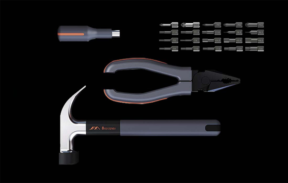 JIMI Home X1-A Tool Set, BoxEnclosed in a handy box, the JIMI Home tools have been selected to meet the need for the most basic home repairs and work. Inside you'll find: a 3.5 m tape measure, pliers, a cobbler's hammer, pliers, a set of Allen wrenches and two screwdrivers with small and large handles, along with 20 different bits. Small home repairs are no longer a challenge, even for amateurs.