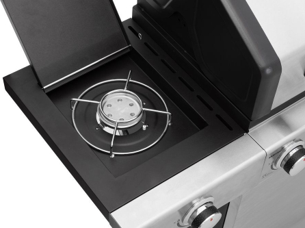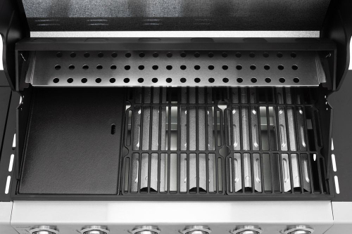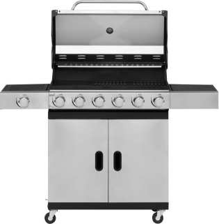 Six-burner gas grill with side burner. Power of main burners 6 x 3,0 kW. Side burner 3,2 kW. Total power 21,2 kW. Burners made from stainless steel. Grilling area 78 x 38 cm, divided between 2 piece of cast iron grid 26 x 38 cm and 1 piece of cast iron grilling plate 26 x 38 cm. Grid and grilling plate of matt enameled cast iron. Warming rack 74 x 13 cm, 430 stainless steel. Grill double lid 430 stainless steel, body and trolley in powder-coated steel. 4 pieces of flame tamers made of aluminized sheet metal. Grease tray under the grill. Storage cabinet for accessories. 2 small and 2 lockable small wheels make it easy to move the grill. Mustang thermometer. Suitable cover 602301 (not incl.). |