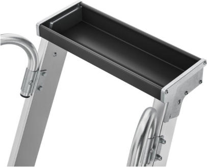 Передвижная алюминиевая лестница-платформа с большой рабочей поверхностью и практичным лотком для хранения.