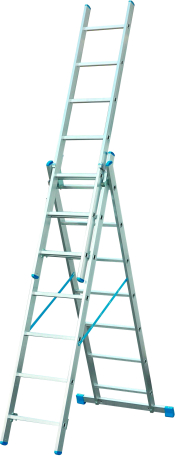 Trīsposmu alumīnija daudzfunkcionālas kāpnes, kas izmantojamas kā slīpas, pagarināmas un pakāpienu kāpnes ar izvelkamu kāpņu daļu. Tērauda eņģes, kas nodrošina vienkāršu un drošu kāpņu pagarināšanu. Drošības bloķēšanas siksnas novērš nejaušu kāpņu atvēršanos. Pašbloķēšanas sistēma novērš kāpņu atvēršanos transportēšanas laikā. Pretslīdēšanas kājas nodrošina kāpņu stabilitāti. Piemērotas lietošanai gan telpās, gan ārā. Tehniskie dati: