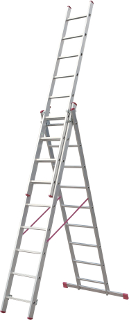 Trīsposmu alumīnija daudzfunkcionālas kāpnes, kas izmantojamas kā slīpas, pagarināmas un pakāpienu kāpnes ar izvelkamu kāpņu daļu. Tērauda eņģes, kas nodrošina vienkāršu un drošu kāpņu pagarināšanu. Drošības bloķēšanas siksnas novērš nejaušu kāpņu atvēršanos. Pašbloķēšanas sistēma novērš kāpņu atvēršanos transportēšanas laikā. Pretslīdēšanas kājas nodrošina kāpņu stabilitāti. Piemērotas lietošanai gan telpās, gan ārā. Tehniskie dati: