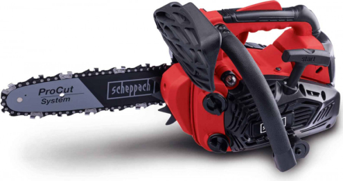| Dimensions L x W x H 250 x 230 x 220 mm Engine type 2-Stroke Fuel mixture 40:1 Engine displacement 25.4 cc Chain bar length 25 cm Cutting length max. D 21 cm Chain tension adjustment Yes Chain brake Yes Oil tank capacity 0.16 L Fuel tank capacity 0.23 L Output 700 W (0.95 HP) • The low weight and well-balanced saw body makes it very easy to work with • 25.4 cc – 2-Stroke engine offers powerful performance • 10" bar and chain with low kickback • Heavy-duty air filter helps add longevity to the engine • Can cut 21 cm diameter trees • Low emissions • Reliable safety chain brake to prevent accidents You need a chainsaw for in-tree work that’s lightweight and powerful, allowing you to effectively prune, trim and shape high above the ground. The Scheppach CSP2540 top handle chainsaw is the ideal unit therefore. | ||||||||||||||||||||||||||