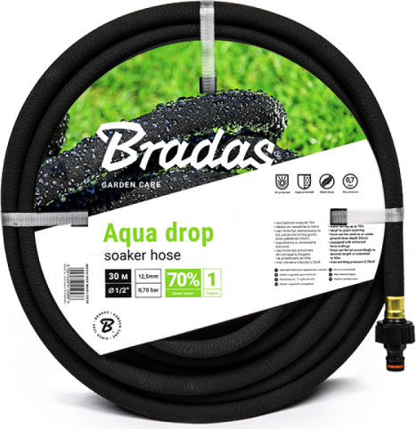 AQUA-DROP - гибкий и прочный, изготовлен из 100% переработанной высококачественной резины, что позволяет воде проходить равномерно по всей длине. Обеспечивает экономию воды до 70%. Установленные стандартные быстроразъемные адаптеры позволяют быстро и легко подсоединиться к садовому шлангу. Его можно покрыть мульчей или закопать в землю на глубину до 20 см. Это идеальное решение для точного и экономичного полива растений. Максимальная длина шланга для правильной работы не может превышать 30 м. Расход воды на 1м: 0,76л - 1,26л/мин при давлении 0,7БАР. Комплект оснащен прокладкой, снижающей давление. Предупреждение: - не использовать для питьевой воды - не используйте горячую воду для полива - При первом использовании выпустите воздух по всей длине шланга. | ||||||||||||||||||||||