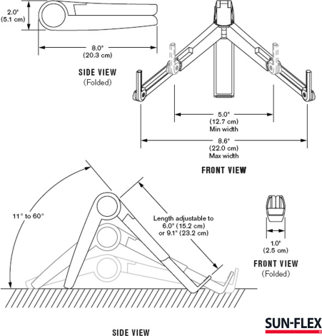 • Materiāls: Metāls, cieta ABS plastmasa • Izmērs: Skatīt tabulu • Svars: 250 grami • Krāsa: Melna / sudraba • Regulējams: jā, leņķis, augstums un garums • Lieta: jā, iekļauta • Iepakojums: Vienreizējs, transporta iepakojums 45 gab. • Art.nr .: 100122: SUN-FLEX®GRAVITY STAND (GTIN13: 7350042900385) | ||||