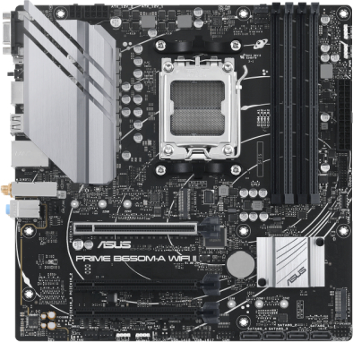 Asus PRIME B650M-A WIFI II Processor family AMD, Processor socket AM5, DDR5 DIMM, Memory slots 4, Supported hard disk drive interfaces SATA, M.2, Number of SATA connectors 4, Chipset AMD B650, mATX