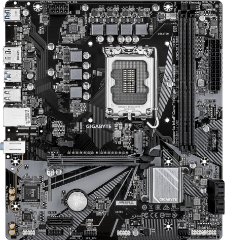 | Summary | GIGABYTE B760M H V2 Motherboard - Supports Intel Core 14th Gen CPUs, 5+1+1 Phases Digital VRM, up to 8000MHz DDR5 (O.C.), 1xPCIe 4.0 M.2, 1GbE LAN, USB 3.2 Gen1. Processor manufacturer: Intel, Processor socket: LGA 1700, Compatible processor series: Intel® Celeron®, Intel Core i3 12th Gen, Intel Core i3 13th Gen, Intel Core i3 14th Gen, Intel.... Supported memory types: DDR5-SDRAM, Maximum internal memory: 128 GB, Memory slots type: DIMM. Supported storage drive interfaces: M.2, PCI Express 4.0, SATA III, Supported storage drive types: HDD & SSD, RAID levels: 0, 1, 5, 10. Maximum resolution: 4096 x 2304 pixels. Ethernet interface type: Gigabit Ethernet, LAN controller: Realtek RTL8111H |