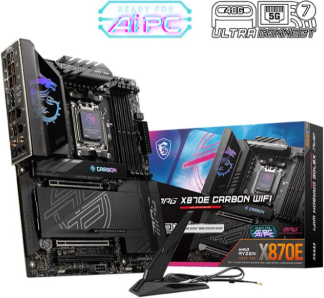 - Supports AMD Ryzen™ 9000 / 8000 / 7000 Series Desktop Processors - Supports DDR5 Memory, Dual Channel DDR5 8400+ MT/s (OC) - Ultra Performance: 18+2+1 Duet Rail Power System, dual 8-pin CPU power connectors, Core Boost, Memory Boost, 8-layer PCB made by 2oz thickened copper and server-grade level material - Frozr Guard: Enlarged heatsink with heat-pipe, MOSFET thermal pads rated for 7W/mk, additional choke thermal pads and M.2 Shield Frozr are built for high performance system and non-stop gaming experience - EZ DIY: EZ PCIe Release, EZ M.2 Shield Frozr II, EZ M.2 Clip II and EZ Antenna - Lightning Fast Game experience: PCIe 5.0 slot, Lightning Gen 5 x4 M.2 - Ultra Connect: USB4 and 5G LAN + 2.5G LAN with Wi-Fi 7 Solution - The latest solution for professional and multimedia use, delivering secure, stable, and high-speed networking and data transmission - Audio Boost 5: Reward your ears with studio grade sound quality for the most immersive gaming experience Manufacturer Website: https://www.msi.com/Motherboard/MPG-X870E-CARBON-WIFI | ||||||||||||||||||||||||||||||||||||||||||||||||||||||||||||||||||||||||||||||||||