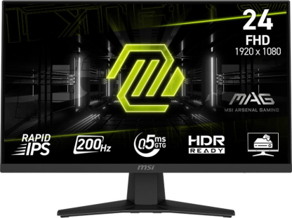 Experience immersive gaming with the MAG 244F gaming monitor. It features a 1920x1080 (FHD) panel, a 200Hz refresh rate, and a rapid 0.5ms (GtG, Min) response time. The monitor is HDR Ready, enhancing eye-catching details through adjustments in contrast and shadows. Designed for competitive FPS, first-person RPG/MMORPG, and flight/racing simulator genres, the MSI MAG 244F Gaming Monitor takes casual gaming to a new level, challenging players to see beyond the game.