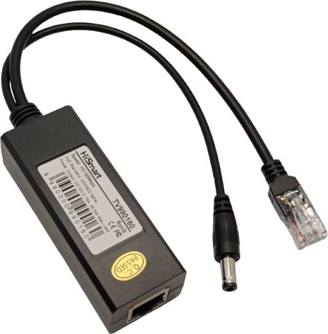 | PoE 100M Splitter Cable 25.5W. Features: 1x RJ45 female input port + 1x RJ45 male output port + 1x DC (5.5x2.1mm) male output port. Supports IEEE802.3af, compatible with Mid-Span(4,5+; 7, 8-) and End-Span(1,2+; 3,6-). Voltage input range: 44-57V, power output: 25.5W, with over 82% efficiency. Support isolation function. Default voltage output: 12V. High voltage isolation: 1500V (Input stage to output stage). Protections: short circuit / over voltage / over-temperature. Specifications: Connectors: 1x RJ45 F input port. 1x RJ45 M output port. 1x DC M output port. PoE voltage Input: 44-57V. Voltage output: DC 12V. Working temperature: -20°C~+60°C. Working humidity: 20-80% RH. Rated power output: 25.5W. Transmission bandwidth: 10/100Mbps. Port Protection: meet the IEC61000-4-2(ESD)±15KV (air), ±8KV (contact); compatible with 8/20us, 24A(12A). Certifications: CE, FCC, ROHS. Warranty: 24 months. |