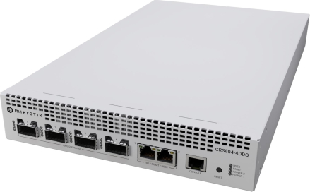 The CRS804 DDQ is a compact and reliable 400 Gigabit switch designed for modern AI workloads and next-generation network upgrades. With four 400G QSFP-DD ports and dual 1/10G Ethernet, it delivers exceptional bandwidth density in a quiet and efficient 1U form factor.