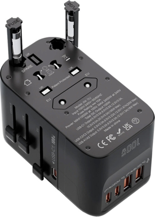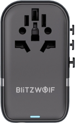 Blitzwolf BW-TA2 5-in-1 Travel Adapter 2xUSB PD + 2xC QC + C GaN 100W.The BlitzWolf BW-TA1 travel adapter is a compact solution for people who travel frequently and need a reliable power source in different countries. With compatibility with outlets in the US, UK, EU, Australia, Canada and many other regions, it eliminates the need for additional adapters. Its compact size (92 × 56 × 56 mm) and light weight of 206 g make it fit easily into any travel bag.