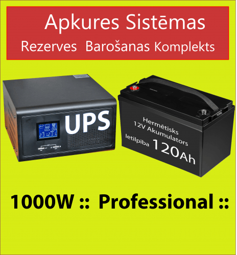 Komplekts: Profesionāls Invertors UPS apkures sistēmai 1000W + 12V 120Ah akum.