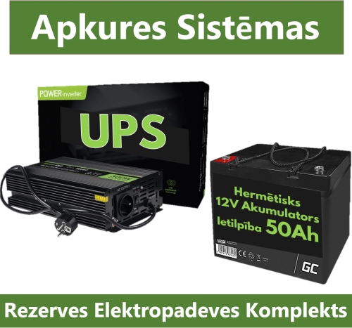 Komplekts Nepārtrauktās barošanas bloks (UPS vai Invertors ) apkures sistēma + Akumulators 12V 44Ah- nepieciešams jebkuram apkures katlam un apkures sistēmai, jo pasargā katla automātiku un cirkulācijas sūkni no sprieguma lēcieniem, kas izraisa elektronikas bojājumus, kā arī nodrošina apkures sistēmas darbību elektrības pazušanas gadījumos. Paredzēts jaudai 300W. Pazūdot sprieguma no tīkla, pārslēdzas <0.01s laikā darba režīmā. Invertors sāk ģenerēt 230V AC tīru sinosoīdu no jebkura 12 Voltu akumulatora (max 120Ah). Kad spriegums kļūst pieejams no elektrotīkla, ierīce akumulatoru pati uzlādē. Invertors darbojas pilnīgi automātiski. Ja nepieciešamās ierīces patēriņš ir 60-70W, tad :<br> Izmantojot 44Ah akumulatoru darbosies līdz 5 stundām <br> Izmantojot 100h akumulatoru darbosies līdz 10-11 stundām Alternatīva ģeneratoram, sprieguma pārveidotājs - invertors. Kluss un vienkāršs lietošanā.