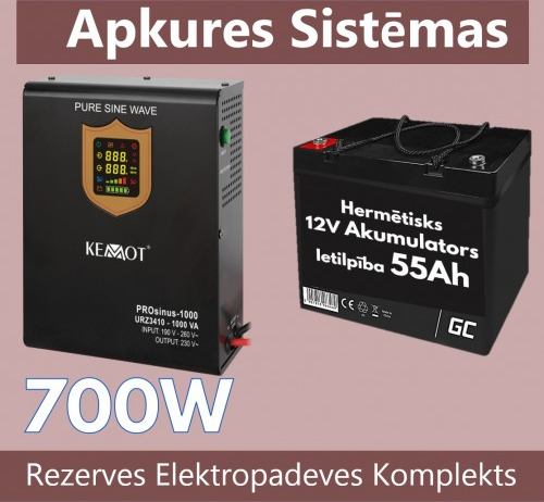Komplekts Nepārtrauktās barošanas bloks (UPS vai Invertors ) apkures sistēma + Akumulators 12V 55Ah- nepieciešams jebkuram apkures katlam un apkures sistēmai, jo pasargā katla automātiku un cirkulācijas sūkni no sprieguma lēcieniem, kas izraisa elektronikas bojājumus, kā arī nodrošina apkures sistēmas darbību elektrības pazušanas gadījumos.Alternatīva ģeneratoram, sprieguma pārveidotājs - invertors.Paredzēts jaudai 700W.Pazūdot sprieguma no tīkla, pārslēdzas <0.01s laikā darba režīmā.Invertors sāk ģenerēt 230V AC tīru sinosoīdu no jebkura 12 Voltu akumulatora (max 200Ah). Kad spriegums kļūst pieejams no elektrotīkla, ierīce akumulatoru pati uzlādē.Invertors darbojas pilnīgi automātiski.Ja nepieciešamās ierīces patēriņš ir 60-70W, tad :<br> Izmantojot 55Ah akumulatoru darbosies līdz 5.5 stundām <br> Izmantojot 100h akumulatoru darbosies līdz 10-12 stundām