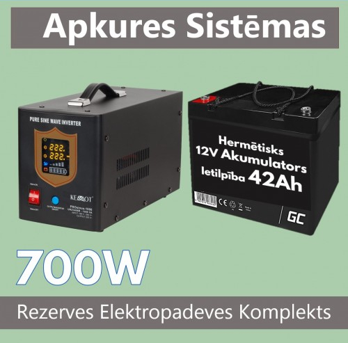 Komplekts Nepārtrauktās barošanas bloks (UPS vai Invertors ) apkures sistēma + Akumulators 12V 42Ah- nepieciešams jebkuram apkures katlam un apkures sistēmai, jo pasargā katla automātiku un cirkulācijas sūkni no sprieguma lēcieniem, kas izraisa elektronikas bojājumus, kā arī nodrošina apkures sistēmas darbību elektrības pazušanas gadījumos.Alternatīva ģeneratoram, sprieguma pārveidotājs - invertors.Paredzēts jaudai 700W.Pazūdot sprieguma no tīkla, pārslēdzas <0.01s laikā darba režīmā.Invertors sāk ģenerēt 230V AC tīru sinosoīdu no jebkura 12 Voltu akumulatora (max 200Ah). Kad spriegums kļūst pieejams no elektrotīkla, ierīce akumulatoru pati uzlādē.Invertors darbojas pilnīgi automātiski.Ja nepieciešamās ierīces patēriņš ir 60-70W, tad :<br> Izmantojot 42Ah akumulatoru darbosies līdz 4 stundām <br> Izmantojot 100h akumulatoru darbosies līdz 10-12 stundām