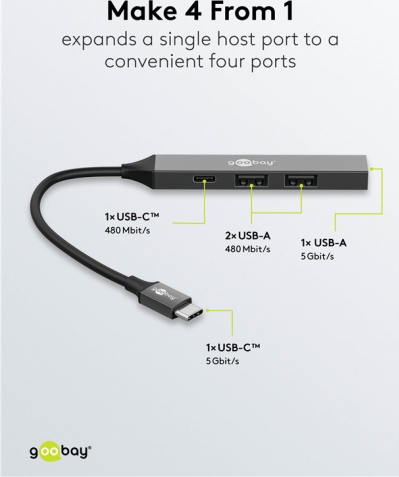 Goobay Slim 4-Port USB Hub, USB-C to USB-C/USB-A, 5 Gbit/s 74459