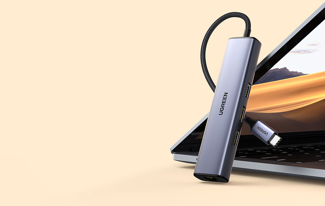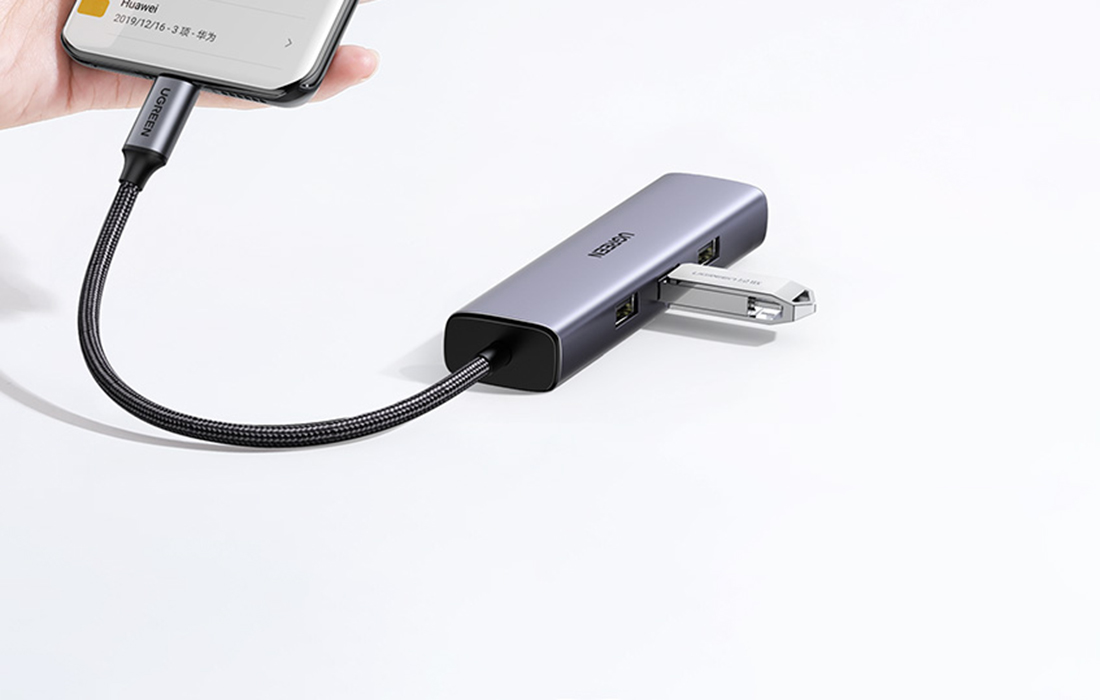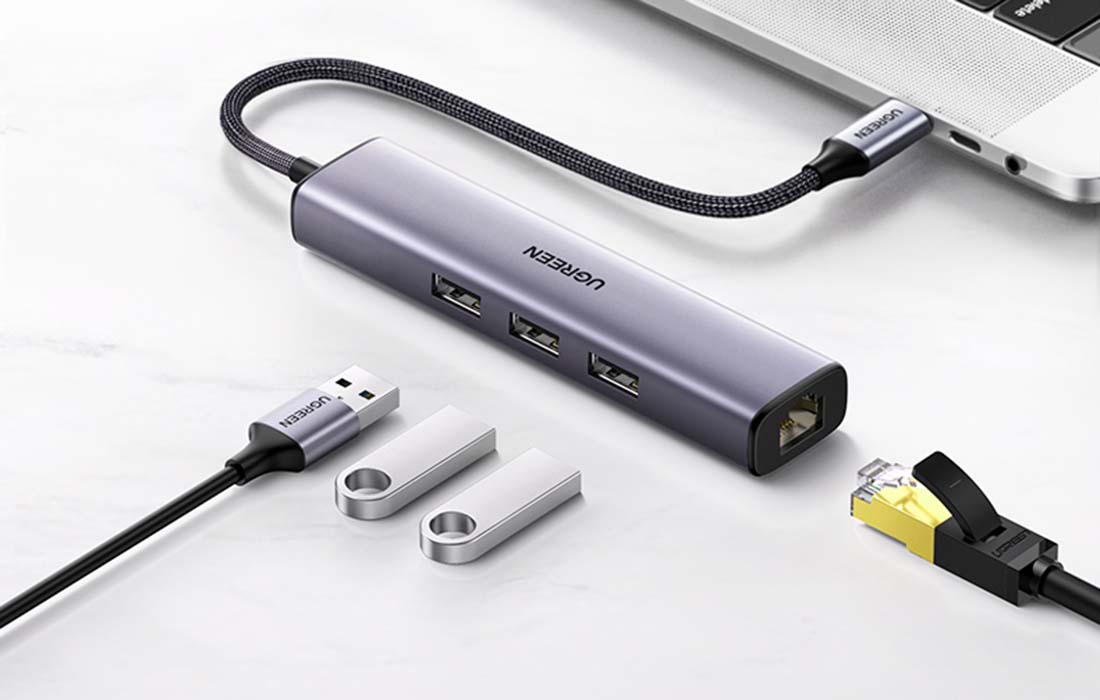 UGREEN CM475 4in1 HubCM475 adapter by UGREEN makes your work easier and expands the possibilities of your equipment. The product is equipped with 3 USB 3.0 ports and one RJ45 input, which provides fast and stable Internet connection.