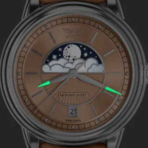 Ciferblatas Tamsoje švytinčios rodyklės, Metalinės valandų padalos, Tamsoje švytinčios rodyklės, Mėnulio fazės indikatorius, Metalinės valandų padalos