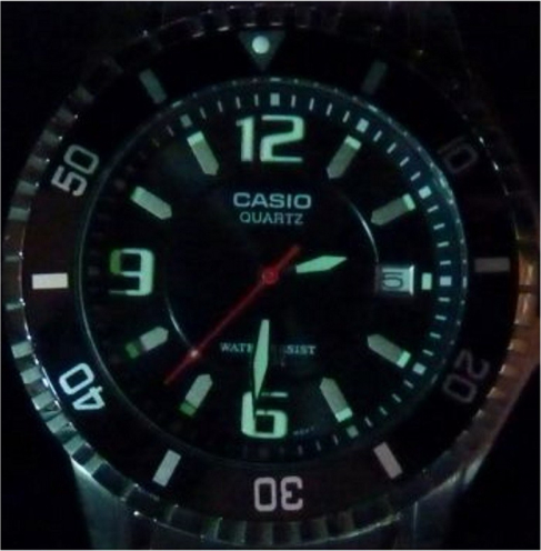 Ciferblatas Rodyklinis, Metalinės valandų padalos, Tamsoje švytinčios valandų padalos, Tamsoje švytinčios rodyklės