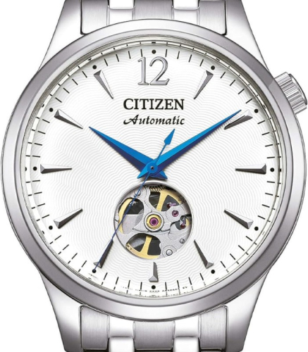Ciferblatas Papuoštas ornamentais, Metalinės valandų padalos, Tamsoje švytinčios valandų padalos, Tamsoje švytinčios rodyklės, Rodyklinis, Per ciferblatą matosi laikrodžio mechanizmas