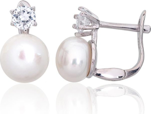 Серебряные серьги на английском замке #2203847(PRh-Gr)_CZ+PE, Серебро 925°, родий (покрытие), Цирконы, Жемчуг, 2.4 гр.
