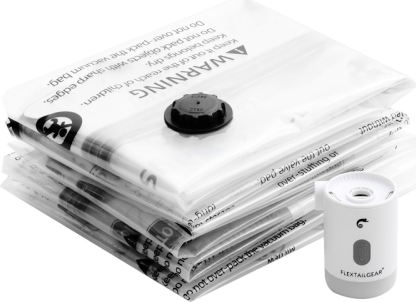 Flextail S vacuum storage bagsFlextail S vacuum bags reduce the volume of clothing or textiles by up to 80% by removing air from inside the sealed bag, making it easier to pack in a suitcase and store at home for long periods of time. The 40 × 60 cm size holds approximately 6-8 sweaters or a similar amount of soft clothing, creating a compact, stable package that takes up significantly less space. The valve design is engineered to work with Flextail pumps such as the Tiny Pump 2X or Max Pump 3, which provide faster compression and a more durable vacuum effect than manual methods. The airtight material protects the contents from moisture, dust, and odors, and the transparent form allows you to easily identify the contents without opening. The set includes four bags.