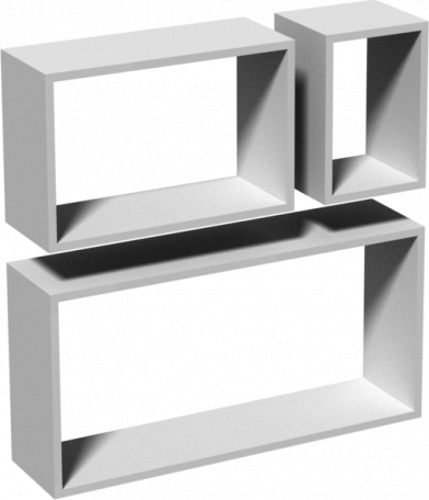 | Trīs dažādu formu piekaramo plauktu komplekts baltā krāsā. Plauktus var uzstādīt jebkurā telpā. Tiem ir iekšējie kronšteini, pateicoties kuriem tie tiek piestiprināti pie sienas absolūti neredzamā veidā. Plauktus pie sienas ir jāpiestiprina ar sienas veidam atbilstošām skrūvēm un dībeļiem. Plauktu izmēri (G x P x A) - 600 x 150 x 300 mm, 380 x 150 x 250 mm, 170 x 150 x 250 mm. |