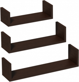 | Trīs dažādu izmēru U-formas piekaramo plauktu komplekts tumši brūnā krāsā. Plauktus var uzstādīt jebkurā telpā. Tiem ir iekšējie kronšteini, pateicoties kuriem tie tiek piestiprināti pie sienas absolūti neredzamā veidā. Plauktus pie sienas ir jāpiestiprina ar sienas veidam atbilstošām skrūvēm un dībeļiem. Plauktu izmēri (G x P x A) - 420 x 100 x 100 mm, 340 x 100 x 88 mm, 260 x 100 x 76 mm. |