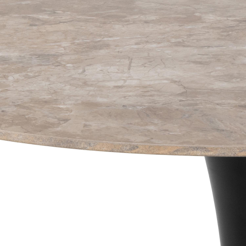 | Dining table sets the scene for many special moments. The table has a modern look. Standing on a round black base, the slim top features brown ceramic, an easy-care material known for its heat and scratch-resistant properties. It is a design that offers both great look and practicality. The table top is made of brown Aberta polished ceramic. The trumpet base is made of matt black rough powder coated steel. The dimensions are D90xH75cm. | ||||||||