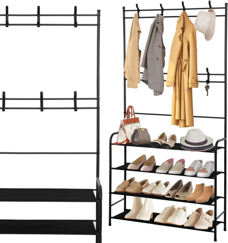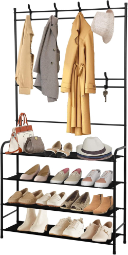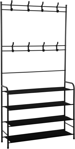Бренд: Спрингос® Черный цвет Материал: металл + ткань. Количество полок для обуви: 4 Количество вешалок для шляп: 8 Товар для самостоятельной сборки Размеры: Общая высота: 150 см. Общая длина: 80 см. Общая глубина: 25 см Размеры полки для обуви: 74 х 24 см. Расстояние между полками: 16 см. Расстояние от земли до 1 полки: 6 см. Высота от самой высокой полки до вешалок: 48 см. Длина вешалки: 12 см. Ширина вешалки: 1,5 см. Толщина строительных трубок: 1,5/0,5 см. |