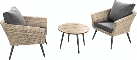 Pīts: pusapaļa polirotangpalma, gluda struktūra Mēbeļu konstrukcija: alumīnijs (nepieciešama vienkārša montāža) Komplekts sastāv no 3 elementiem: 2 x atzveltnes krēsli: