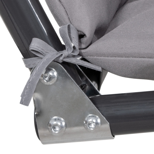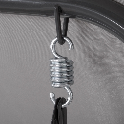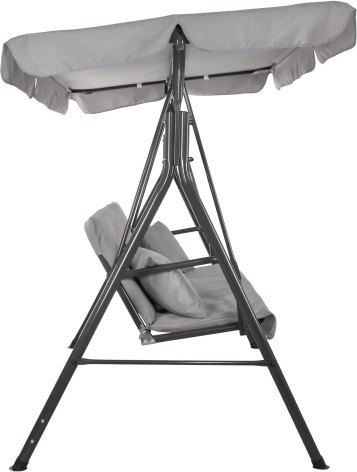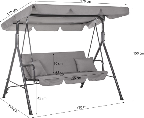 | Materiāls: pulverkrāsots tērauds, poliesters 3vietīgas šūpoles Izturīgs, pret bojājumiem izturīgs rāmis Ūdensnecaurlaidīgs materiāls Aizsardzība pret rūsēšanu Atsperu stiprinājums Neslīdoši kāju gali Kopējais augstums: 150 cm Sēdekļa dz |