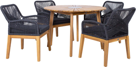 The table, chair legs and base frame are made of acacia wood and finished with teak-colored wood preservative oil.