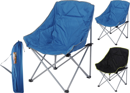 | Saliekams poliestera atpūtas krēsls ar metāla rāmi un somu pārnēsāšanai. Maksimālais pieļaujamais svars 120 kg. |
