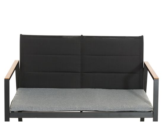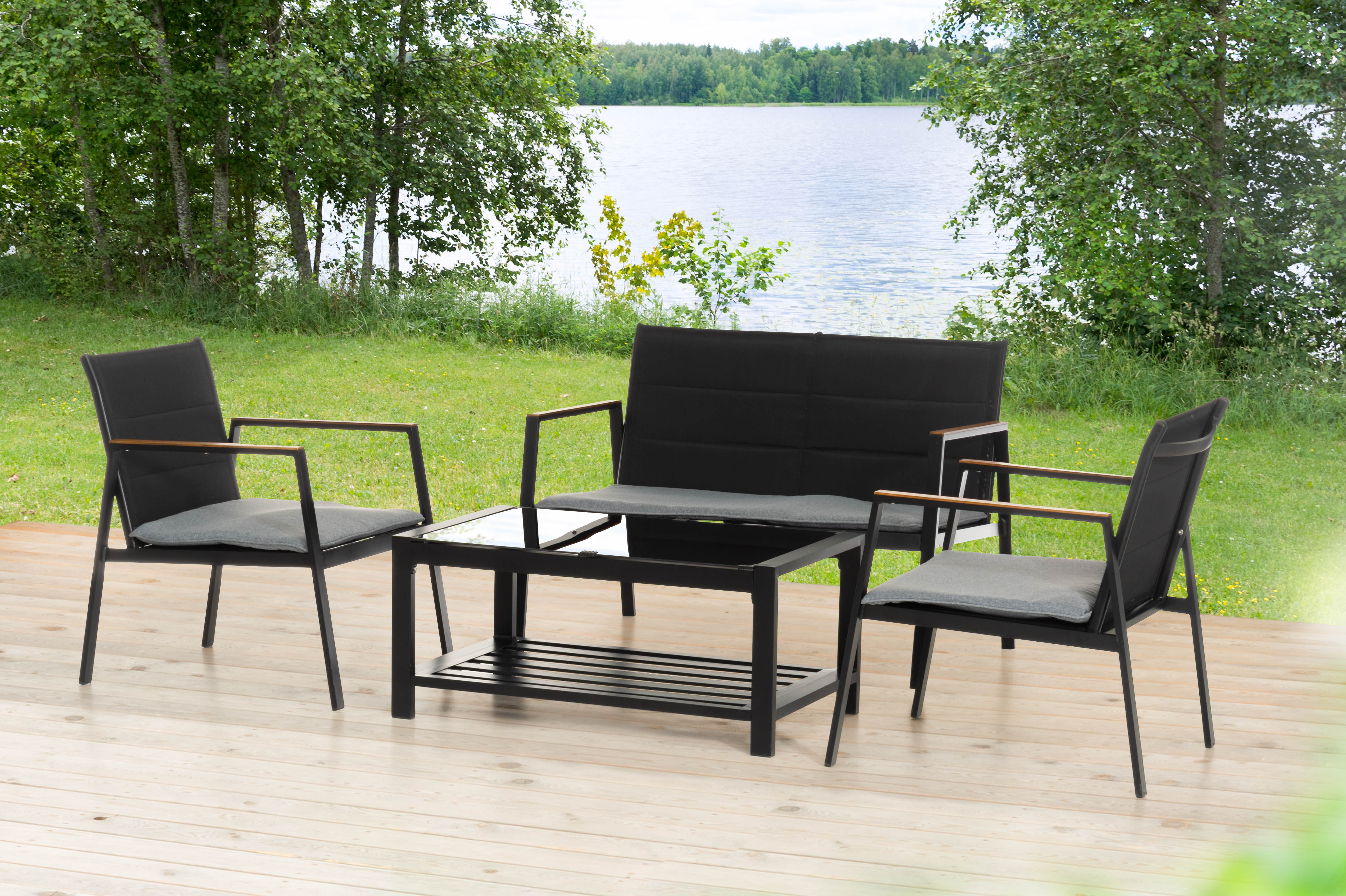 Galds 95 x 55 x 43 cm, krēsli 60 x 70 x 80 cm un dīvāns 111 x 70 x 80 cm. Alumīnija rāmis. Polsterētie porolona (230 g) sēdekļa spilveni ir 3 cm biezi. Galda plate no melna stikla. Krēsla maks. nestspēja 160 kg, dīvāna maks. nestspēja 320 kg.