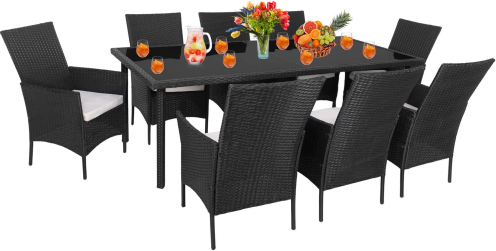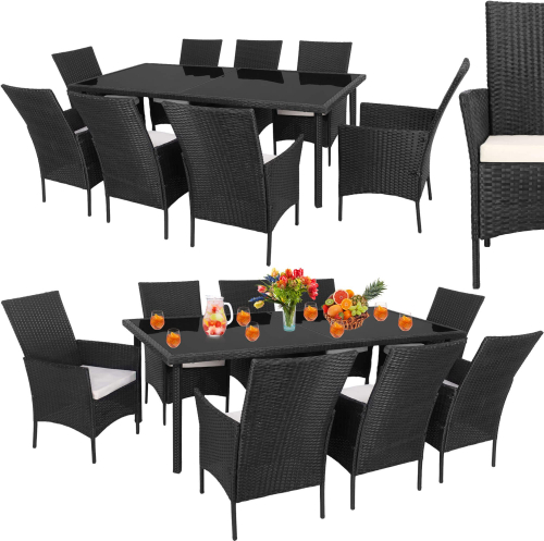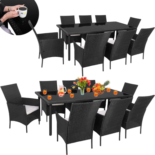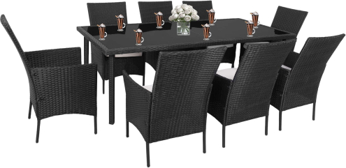 Включенные элементы: 8 стульев, стол со стеклянной столешницей.