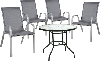 | Садовая мебель DUBLIN стол и 4 стула, серый. Размеры стола D90xH71см. Столешница: 5мм прозрачное закалённое стекло. Темно-коричневая стальная рама. Стул 55,5x73xH90см, серый. Текстильное сиденье стула хорошо вентилируется, быстро сохнет и легко чистится. Каркас и ножки стула изготовлены из стали и покрыты порошковой краской серого цвета. Стулья можно штабелировать, что позволяет сэкономить место, когда они не используются. Размеры стула 55,5x73xH90см. Ширина сиденья 45см, глубина сиденья 41см, высота сиденья 44см. Высота спинки 57см. Высота подлокотника от земли 61см. Максимальный вес 100кг. | ||||||||