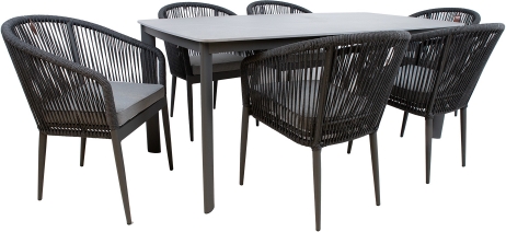 | Садовая мебель ECCO стол и 6 стульев. Стол 180x90xH75см, столешница: 11мм спеченный камень. Стол с каменной столешницей сочетает в себе минималистский дизайн и инновационные технологии. Столешница из спеченного камня изготовлена ??с использованием последних технологических достижений, имитирующих процесс естественного образования горных пород глубоко внутри земной коры. Частицы каолина (фарфоровая глина) обрабатываются при 1200 градусах, в результате получается материал, напоминающий по своим свойствам и внешнему виду натуральный камень. Столешница тонкая, но очень прочная (относительная твердость по шкале Мооса 7), прочная, выдерживает высокие температуры и различные погодные условия, не впитывает пятна, очень проста в уходе. Поскольку химические связующие не использовались, материал гигиеничен. ВНИМАНИЕ! Избегайте столкновений, ударов и падений. Каркасы стола и стульев изготовлены из алюминия и покрыты порошковой краской серого цвета. Спинка и подлокотники кресла обиты простой веревкой. Подушка входит в комплект. Чехол на подушку изготовлен из полиэстера. Размеры подушки сиденья 45x42x5см. Основание сиденья поддерживается алюминиевыми планками. Размеры кресла 57x65xH8см, предельный вес 100кг. Стулья можно штабелировать, их легко хранить и экономить место. Продукт долговечен в меняющихся погодных условиях и очень прост в уходе. ХРАНЕНИЕ: в конце летнего сезона рекомендуем хранить садовую мебель в помещении. Очистите и высушите мебель перед хранением. Используйте для хранения прохладное, сухое, хорошо проветриваемое помещение. | ||||||||