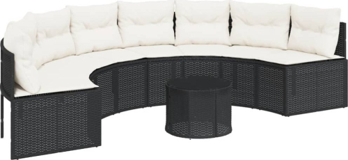 vidaXL Sofa ogrodowa, stolik i poduszki, półokrągła, czarny rattan PE